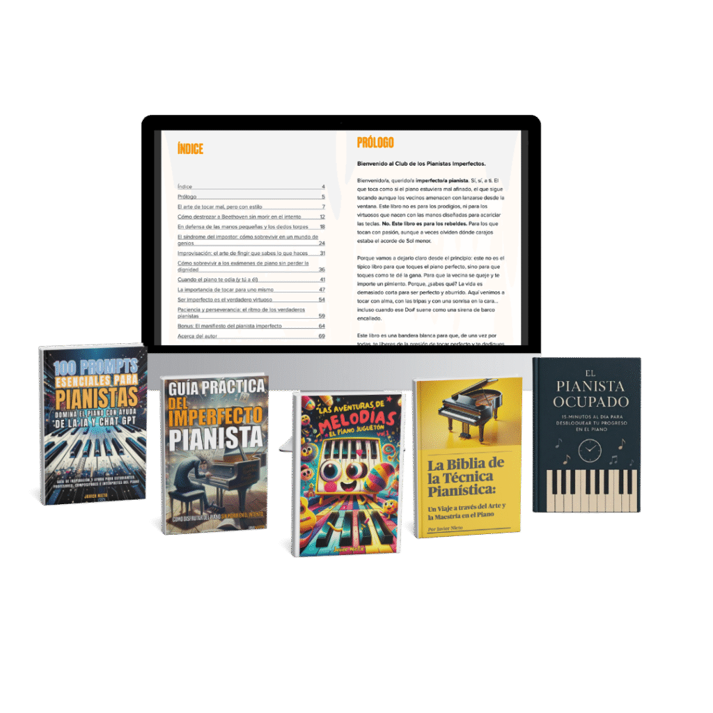 Los cinco libros esenciales para estudiantes pianistas reunidos en un solo pack; técnica, mentalidad, estrategia, entretenimiento, humor y práctica efectiva.